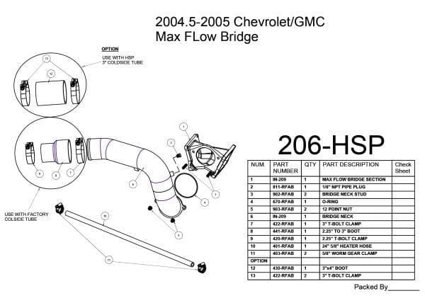 Increase performance and flow with our upgraded 3 Inch Max Flow Bridge. Our precision cast and CNC machined bridge section allows for maximum efficiency, as well as, a perfect fit every time. This component is designed to not only increase the efficiency of your Duramax but also provide a solution to the factory unit which is very restrictive and known to have boost leaks. This kit comes with a 2.25 Inch boot to pair with the factory cold side.